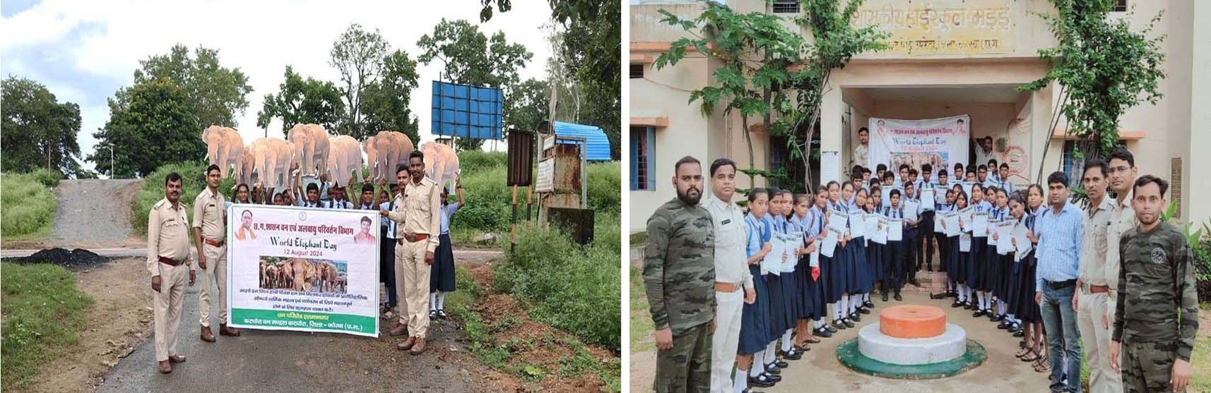 कटघोरा वन मंडल कार्यालय प्रांगण में मुख्य अतिथि विधायक श्री प्रेमचंद पटेल की उपस्थिति में विश्व हाथी दिवस कार्यक्रम आयोजित किया गया। विधायक श्री पटेल ने अपने उद्बोधन में हाथी और मानव के ऐतिहासिक सह अस्तित्व के बारे मे जानकारी दी। उन्होंने कहा कि प्राचीन काल में मंदिरां को बनाने भारी परिवहन, हस्तिसेना में हाथियां की अहम भिमका रही है। हाथियां का अस्तित्व मानव सभ्यता से भी अधिक प्राचीन है। साथ ही साथ उनके द्वारा लेमरू हाथी रिजर्व के विकास हेतु शासन से चर्चा करने की बात कही। विधायक ने धरमजयगढ़ वनमण्डल से आए हाथी द्वारा किये गए जनहानि पर अपनी संवेदना व्यक्त की तथा वन विभाग को हाथी मानव द्वन्द के रोकथाम में विभाग को पूर्ण सहयोग प्रदान करने की बात कही। इस अवसर पर स्थानीय जनप्रतिनिधि, गणमान्य नागरिक, विभागीय अधिकारी-कर्मचारी उपस्थित थे।कटघोरा वनमण्डल के एतमानगर परिक्षेत्र में मड़ई ग्राम स्थित शासकीय हाईस्कूल के 9वी एवं 10वीं के छात्र-छात्राओं हेतु हाथी मानव द्वन्द विषय पर निबंध लेखन एवं चित्रकला प्रतियोगिता का आयोजन किया गया। साथ ही स्कूल के अध्यापक, छात्र-छात्रा एवं ग्राम मडइऱ् व बंजारी के सरंपच की उपस्थिति में जन जागरूकता रैली निकाली गयी। कटघोरा वनमण्डल के केन्दई परिक्षेत्र के शासकीय हायर सेकेण्डरी स्कूल मोरगा में भी छात्र-छात्राओ हेतु चित्रकला प्रतियोगिता का आयोजन किया गया। जटगा एवं पसान परिक्षेत्र के स्कूलों में भी छात्र-छात्राओं के लिए निबंध लेखन, चित्रकला तथा जन जागरूकता रैली का आयोजन किया गया।