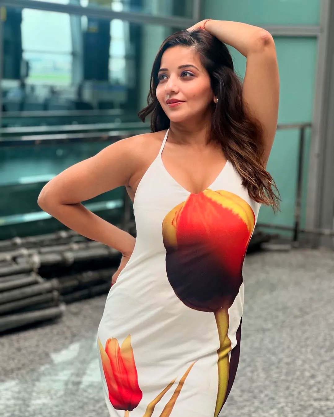 फोटोज में आप देख सकते हैं एक्ट्रेस मोनालिसा ने व्हाइट और ऑरेंज प्रिंट में सिंगल डोरी वाला बॉडीकॉन आउटफिट पहना हुआ है। एक्ट्रेस अपने इस लुक में बेहद ही शानदार नजर आ रही हैं।