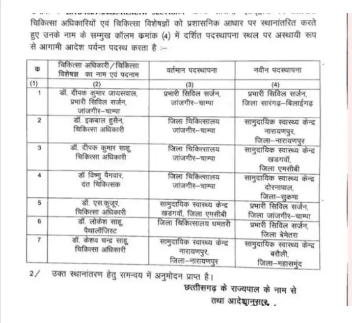 रायपुर: छत्तीसगढ़ सरकार ने जांजगीर चांपा से 4, खड़गांव जिला MCB से 1,धमतरी से 1और नारायणपुर से 1 चिकित्सा अधिकारी / चिकित्सा विशेषज्ञों का तबादला आदेश जारी किया है। कुल सात चिकित्सकों का तबादला किया गया हैं।