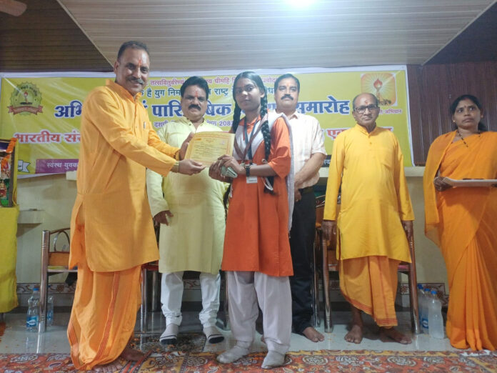 श्रेष्ठ प्रदर्शन के आधार पर जिले के 24 विद्यालयों को स्मृति चिन्ह , प्राचार्यों एवं 278 सहयोगी शिक्षकों/शिक्षिकाओं को प्रशस्ति पत्र प्रदान कर सम्मानित किया गया। तामेश्वर उपाध्याय नव कहा कि आजकल के बच्चे पाश्चात्य सभ्यता एवं संस्कृति का तीब्र गति से अंधानुकरण कर रहे हैं।स्कूल एवं कालेज के पाठ्यक्रम में बच्चों को सामान्य ज्ञान, तकनीकी ज्ञान, व्यवसायिक ज्ञान आदि दिया जाता है लेकिन अपनी संस्कृति, नैतिक मूल्यों का महत्व भारतीय संस्कृति ही सिखाती है जिसके लिए यह परीक्षा बहुत ही उपयोगी है। इस परीक्षा के पाठ्यक्रम/विषयवस्तु में शामिल वेद, पुराण, उपनिषद, दर्शन शास्त्रों के जीवनोपयोगी सूत्रों के माध्यम से बच्चों में दिव्य संस्कार स्थापित किये जा रहे हैं ताकि भावी पीढ़ी को संस्कारवान पीढ़ी के रूप में गढ़ी जा सके। मुख्य अतिथि संजू देवी राजपूत ने विद्यार्थियों से भारतीय संस्कृति को अपने जीवन का अभिन्न अंग बनाने का आग्रह किया। इस अवसर पर छात्र/छात्राओं ने भी अपने विचार प्रस्तुत किये।