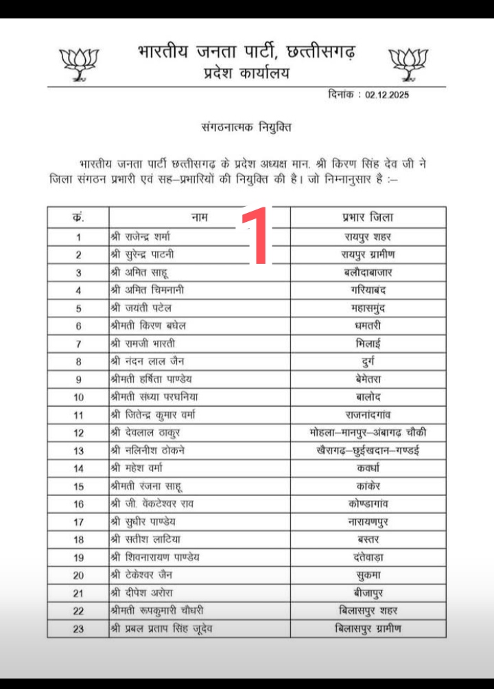 रायपुर छत्तीसगढ़ 2 दिसंबर: भारतीय जनता पार्टी (BJP) छत्तीसगढ़ के प्रदेश अध्यक्ष श्री किरण सिंह देव ने राष्ट्रीय नेतृत्व की सहमति से संगठनात्मक गतिविधियों को और अधिक प्रभावी बनाने के उद्देश्य से जिला संगठन प्रभारियों और विधानसभा प्रभारियों की नियुक्तियों की घोषणा की है।