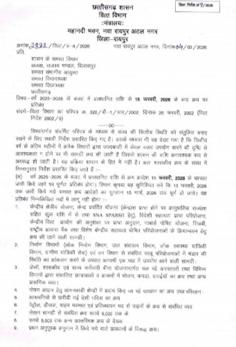 नवा रायपुर, 05 फरवरी 2026 छत्तीसगढ़ शासन के वित्त विभाग ने राज्य की वित्तीय स्थिति को संतुलित बनाए रखने और बजट के दुरुपयोग को रोकने के लिए एक महत्वपूर्ण कड़ा कदम उठाया है। विभाग द्वारा जारी नवीनतम आदेश के अनुसार, वित्तीय वर्ष 2025-26 के बजट से किसी भी सामग्री के लिए क्रय आदेश (Purchase Order) जारी करने की अंतिम तिथि 15 फरवरी 2026 तय की गई है। इस तिथि के बाद नया क्रय आदेश जारी करने पर पूर्णतः प्रतिबंध रहेगा।