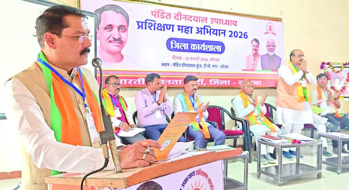 भारतीय जनता पार्टी जिला कोरबा द्वारा पं. दीनदयाल उपाध्याय प्रशिक्षण महाअभियान 2026 की तैयारियों को लेकर जिला स्तरीय प्रशिक्षण कार्यशाला में गोपाल मोदी ने यह बात कही। भाजपा जिला कार्यालय पंडित दीनदयाल कुंज, की. पी. नगर, कोरबा में कार्यशाला आयोजित हुई। अतिथियों को शाल व स्वदेशी वस्तुओं से बने स्मृति चिन्ह भेंट कर उनका स्वागत-अभिनंदन किया गया। प्रथम सत्र में जिला प्रभारी अनिल केसरवानी ने पार्टी के इतिहास, विचारधारा और संगठनात्मक विकास पर विस्तार से प्रकाश डाला। उन्होंने कहा कि भाजपा का मूल मंत्र राष्ट्र प्रथम की भावना है, जिसे कार्यकर्ता अपने आचरण में उतारे। द्वितीय सत्र में विधानसभा सह योजना बैठक में अगली रणनीति और अंतिम सत्र में पीपीटी प्रशिक्षण नवाचार पर चर्चा हुई। इस सत्र की अध्यक्षता महापौर श्रीमती संजू देवी राजपूत ने की। मुख्य वक्ता जिला सह प्रभारी बृजेन्द्र शुक्ला ने संगठनात्मक नवाचार एवं कार्यप्रणाली में आधुनिक तकनीकों के उपयोग पर मार्गदर्शन दिया। पंच परिवर्तन के बारे में पूर्व महापौर जोगेश लांबा और लीनेश ठोकने ने अपनी बात रखी।