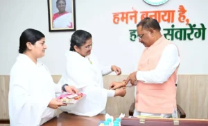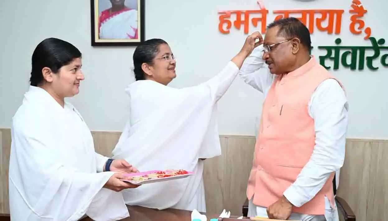 रायपुर । रक्षाबंधन के पावन अवसर पर मुख्यमंत्री विष्णु देव साय के निवास कार्यालय में प्रजापिता ब्रह्मकुमारी ईश्वरीय विश्वविद्यालय रायपुर की संचालिका ब्रह्मकुमारी सविता बहन एवं ब्रह्मकुमारी रश्मि बहन ने मुलाकात कर मुख्यमंत्री साय को राखी बांधी और उनके स्वस्थ, सुदीर्घ और खुशहाल जीवन के लिए मंगलकामनाएं की। मुख्यमंत्री साय ने इस स्नेह और सम्मान के लिए ब्रह्मकुमारी दीदीयों का आभार प्रकट किया।