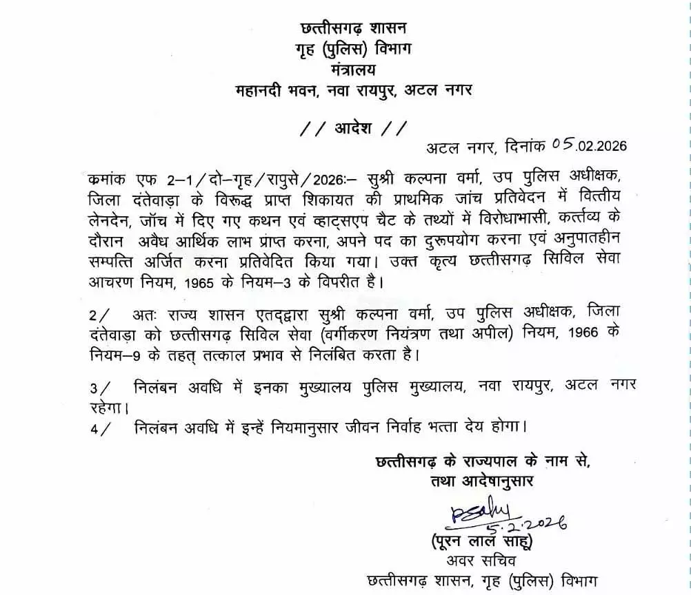 रायपुर। छत्तीसगढ़ शासन के गृह (पुलिस) विभाग ने एक अहम प्रशासनिक कार्रवाई करते हुए दंतेवाड़ा जिले में पदस्थ उप पुलिस अधीक्षक (डीएसपी) कल्पना वर्मा को तत्काल प्रभाव से निलंबित कर दिया है। यह कार्रवाई उनके विरुद्ध प्राप्त शिकायत की प्राथमिक जांच प्रतिवेदन के आधार पर की गई है, जिसमें गंभीर वित्तीय अनियमितताओं, पद के दुरुपयोग और अनुपातहीन संपत्ति अर्जित करने जैसे आरोप सामने आए हैं। गृह (पुलिस) विभाग मंत्रालय महानदी भवन, नवा रायपुर अटल नगर द्वारा 5 फरवरी 2026 को जारी आदेश के अनुसार, डीएसपी कल्पना वर्मा के खिलाफ की गई प्रारंभिक जांच में वित्तीय लेनदेन से जुड़े मामलों में विरोधाभासी तथ्य पाए गए हैं। जांच के दौरान दिए गए कथनों और व्हाट्सएप चैट के तथ्यों में भी स्पष्ट अंतर सामने आया है। इसके अलावा, जांच प्रतिवेदन में यह भी उल्लेख किया गया है कि उन्होंने अपने कर्तव्य के दौरान अवैध आर्थिक लाभ प्राप्त किया तथा अपने पद का दुरुपयोग किया।