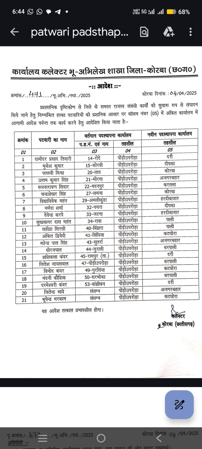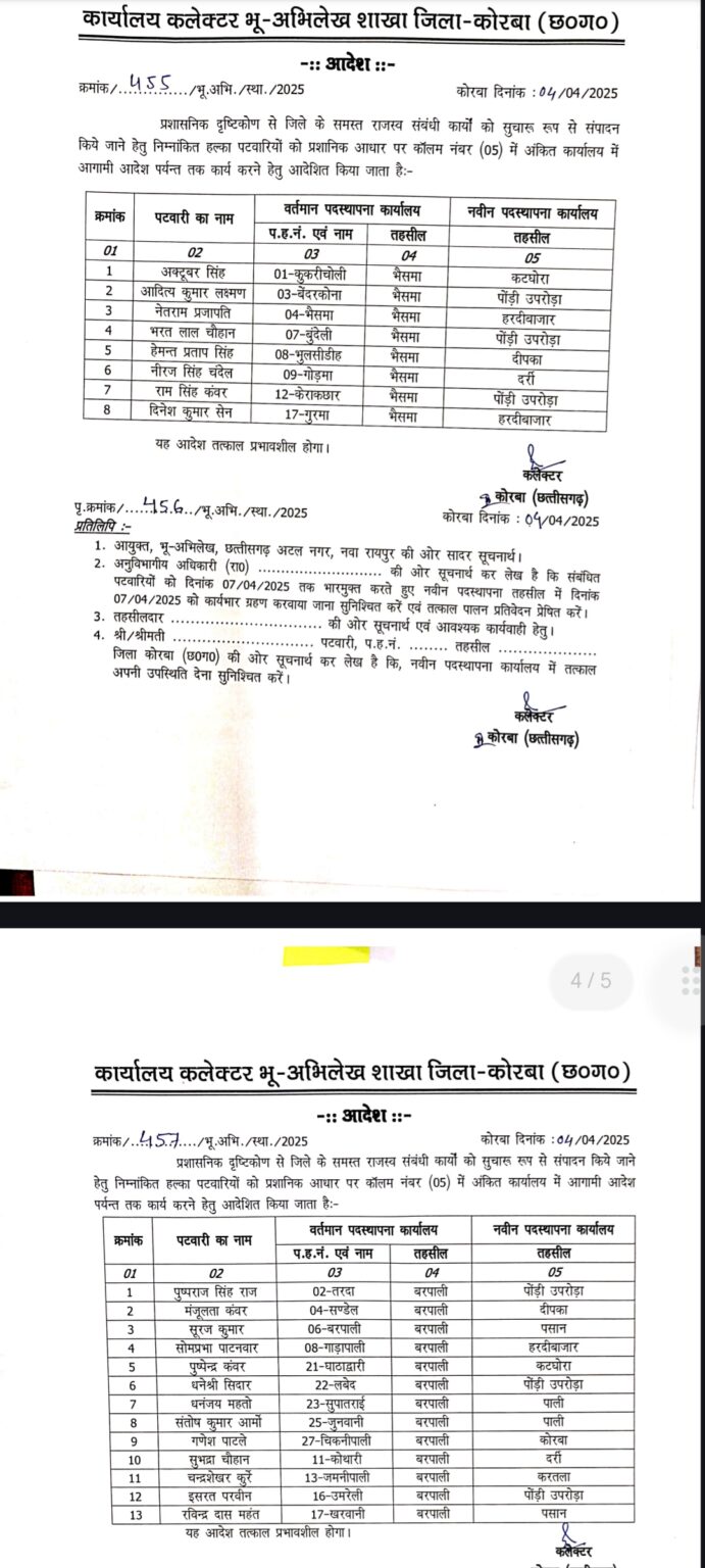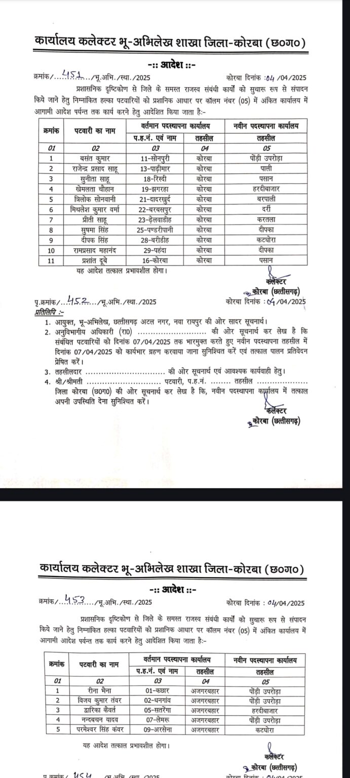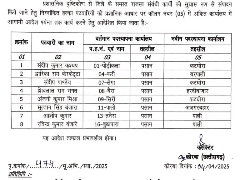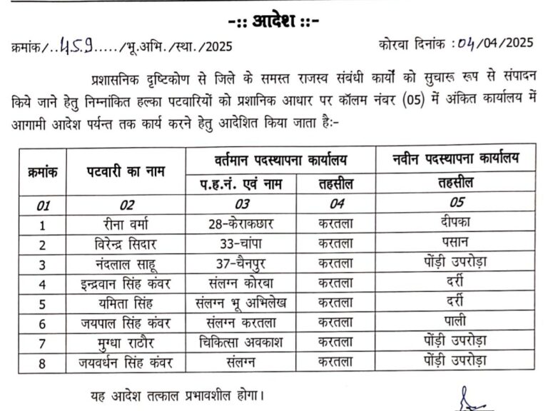कोरबा। कलेक्टर अजीत वसंत ने जिले के अलग-अलग तहसीलों में लंबे समय से पदस्थ पटवारियों को प्रशासनिक दृष्टिकोण से एक तहसील से दूसरे तहसील में तबादला किया है। उन्होंने तहसील कोरबा के 11, अजगरबहार के 5, भैंसमा के 8, बरपाली के 13, करतला के 8, दीपका के 8, कटघोरा के 12, दर्री के 8, हरदीबाजार के 10, पाली के 13, पोड़ी उपरोड़ा के 21, और पसान के 8 पटवारियों कुल 125 पटवारियों का स्थानान्तरण अलग-अलग तहसीलों में किया है। उन्होंने संबंधित पटवारियों को 7 अप्रैल 2025 तक कार्य भार ग्रहण करने के आदेश दिए हैं।