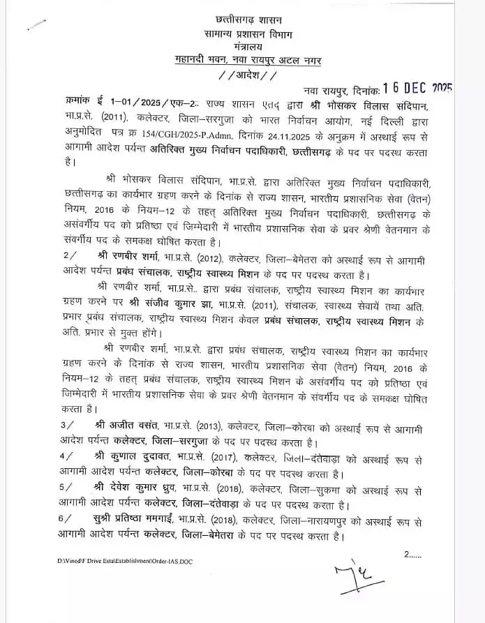कोरबा : छत्तीसगढ़ शासन के सामान्य प्रशासन विभाग (GAD) ने प्रशासनिक स्तर पर बड़ा फेरबदल करते हुए कई IAS अधिकारियों के तबादले के आदेश जारी किए हैं। इस क्रम में कोरबा जिले के कलेक्टर का परिवर्तन किया गया है।