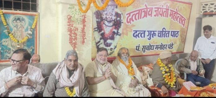 जांजगीर। ब्रह्मपुरी रायपुर स्थित दत्तात्रेय मंदिर में महामंडलेश्वर राजेश्री महन्त रामसुन्दर दास जी महाराज, स्थानीय विधायक सुनील सोनी सहित अनेक गणमान्य अतिथि भगवान दत्तात्रेय जयंती के अवसर पर उपस्थित हुए। इन्होंने मंदिर परिसर में ध्वजारोहण किया, हवन कुंड का परिक्रमा करते हुए कार्यक्रम में सम्मिलित हुए, भगवान के दर्शन पूजन के उपरांत उपस्थित स्रोताओं को अतिथियों के द्वारा संबोधित किया गया। राजेश्री महन्त जी महाराज ने कहा कि – भगवान दत्तात्रेय ने अपने जीवन में चौबीस गुरु बनाये कथन का तात्पर्य यह है कि -प्रत्येक व्यक्ति में कोई न कोई गुण अवश्य होता है, हमें उससे ग्रहण करना चाहिए। कहा भी गया है कि गुन के गाहक सहस नर, बिनु गुन लहै न कोय।। विधायक सुनील सोनी ने कहा कि- भगवान दत्तात्रेय की जयंती के अवसर पर यह कहना चाहूंगा कि आप सभी समाज में एकता बनाकर कार्य करें इससे समाज का विकास होगा। हम विकसित भारत के साथ-साथ विकसित छत्तीसगढ़ राज्य का निर्माण करें यही हम सब का उद्देश्य होना चाहिए। लोगों को जैतू साव मठ ट्रस्ट के सदस्य अजय तिवारी जी ने भी संबोधित किया। सुबोध मनोहर पंडे के द्वारा दत्त गुरु चरित पाठ किया गया। शताब्दी पांडे, हरि बल्लभ अग्रवाल तथा ट्रस्ट कमेटी के सभी सदस्यों सहित श्रद्धालु भक्तगण काफी संख्या में उपस्थित थे। भगवान की आरती संपन्न होने के पश्चात सभी को प्रसाद वितरित किया गया।