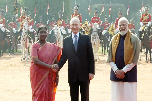 रूसी राष्ट्रपति व्लादिमीर पुतिन राष्ट्रपति भवन पहुंच चुके हैं, जहां राष्ट्रपति द्रौपदी मुर्मू और प्रधानमंत्री नरेंद्र मोदी ने उनका स्वागत किया। राष्ट्रपति भवन पहुंचने पर पुतिन को 21 तोपों की सलामी दी गई। उन्हें गार्ड ऑफ ऑनर दिया गया। रूस के राष्ट्रपति व्लादिमीर पुतिन भारत के दौरे पर हैं। गुरुवार को वह दिल्ली पहुंचे, जहां पीएम मोदी ने खुद एयरपोर्ट पर उनका गर्मजोशी से स्वागत किया। आज रूसी राष्ट्रपति के दौरे का दूसरा दिन है। आज पुतिन और पीएम मोदी 23वें भारत-रूस शिखर सम्मेलन में हिस्सा लेंगे। आज की मीटिंग में सारा फोकस ट्रेड, डिफेंस और एनर्जी से जुड़े कई समझौतों पर होगा जिसका ऐलान दोनों नेता जॉइंट प्रेस कॉन्फ्रेस में करेंगे। शाम को 7 बजे पुतिन भारत की राष्ट्रपति द्रौपदी मुर्मू के साथ मीटिंग के लिए राष्ट्रपति भवन जाएंगे। 2022 में रूस-यूक्रेन जंग शुरू होने के बाद से यह पुतिन का पहला भारत दौरा है। रूसी राष्ट्रपति व्लादिमीर पुतिन राष्ट्रपति भवन के प्रांगण में पहुंचे। राष्ट्रपति द्रौपदी मुर्मू और प्रधानमंत्री नरेंद्र मोदी ने उनका स्वागत किया। राष्ट्रीय राजधानी दिल्ली स्थित राष्ट्रपति भवन में व्लादिमीर पुतिन के स्वागत की तैयारियां चल रही हैं, जहां रूसी राष्ट्रपति का चार वर्षों में पहली बार भारत दौरे पर औपचारिक स्वागत किया जाएगा। रूसी राष्ट्रपति व्लादिमीर पुतिन के औपचारिक स्वागत से पहले प्रधानमंत्री नरेंद्र मोदी राष्ट्रपति भवन पहुंचे। विदेश मंत्री डॉ. एस जयशंकर ने उनका स्वागत किया। 23वें भारत-रूस शिखर सम्मेलन में रक्षा सहयोग को मजबूत करना, बाहरी दबावों से द्विपक्षीय व्यापार को सुरक्षित रखना और स्मॉल मॉड्यूलर रिएक्टर पर सहयोग के नए रास्ते तलाशना मुख्य एजेंडा रहेगा। बातचीत के दौरान भारत रूस से कच्चे तेल के भारी आयात के कारण बढ़ते व्यापार घाटे पर चिंता जताएगा। यह दौरा ऐसे समय हो रहा है जब अमेरिका ने रूस से भारत की तेल खरीद पर भारी टैरिफ लगाकर नई दिल्ली-वॉशिंगटन संबंधों में तनाव बढ़ा दिया है, और इसी प्रभाव पर भी चर्चा होगी।