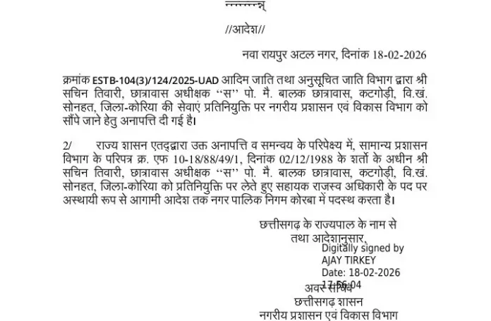 यह आदेश नवा रायपुर अटल नगर से जारी किया गया है, जिस पर नगरीय प्रशासन एवं विकास विभाग के अवर सचिव अजय तिर्की के डिजिटल हस्ताक्षर हैं।