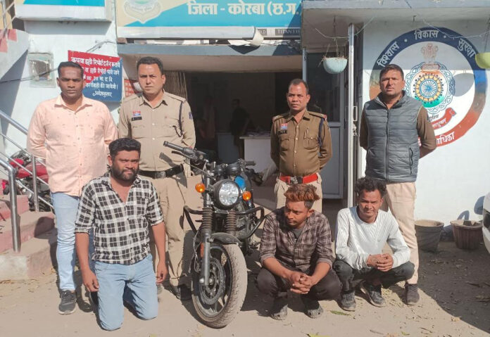 कोरबा। जिले में अपराधों पर प्रभावी नियंत्रण एवं अवैध गतिविधियों पर अंकुश लगाने के उद्देश्य से पुलिस अधीक्षक कोरबा श्री सिद्धार्थ तिवारी द्वारा दिए गए निर्देशों के पालन में अतिरिक्त पुलिस अधीक्षक एवं अनुविभागीय अधिकारी पुलिस के मार्गदर्शन में थाना कोतवाली कोरबा पुलिस द्वारा लगातार प्रभावी कार्यवाही की जा रही है।इसी क्रम में थाना कोतवाली कोरबा क्षेत्र अंतर्गत मोटरसाइकिल चोरी के एक प्रकरण में पुलिस द्वारा त्वरित कार्यवाही करते हुए 03 आरोपियों को गिरफ्तार किया गया है।मामले का संक्षिप्त विवरण इस प्रकार है कि